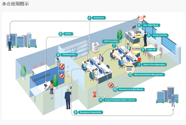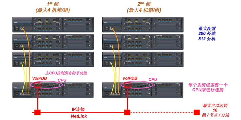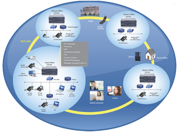 SV8100 通过 NETLINK 协议进行组网,最多16套系统可通过NETLINK组成一套系统,资源和功能能够在主站和分站进行透明的分享,通过网络可以在一个地点远程安装系统。