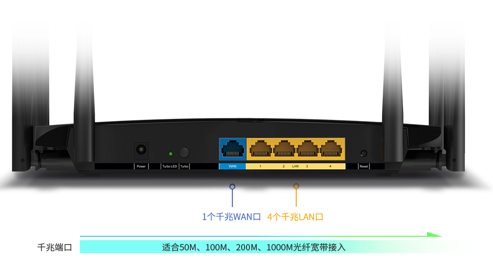 TL-WDR7500的WAN口、LAN口均采用千兆有线端口设计,相比以往百兆端口,有线传输速率提高十倍,